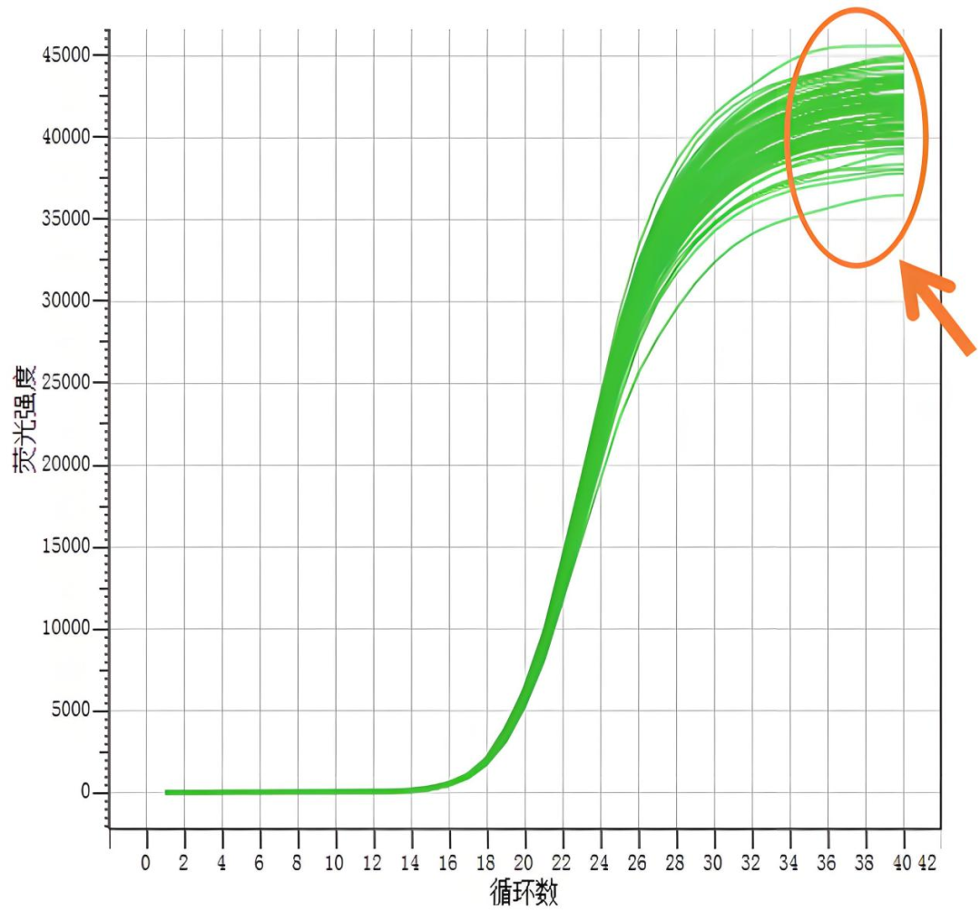 出现在扩增后期,此时反应组分大量消耗,副产物抑制作用增强,扩增速率显著减缓。累积的微小差异被进一步放大,不同复孔在平台期的荧光信号可能出现较大差异,因此该阶段的信号数据通常不用于定量比较。